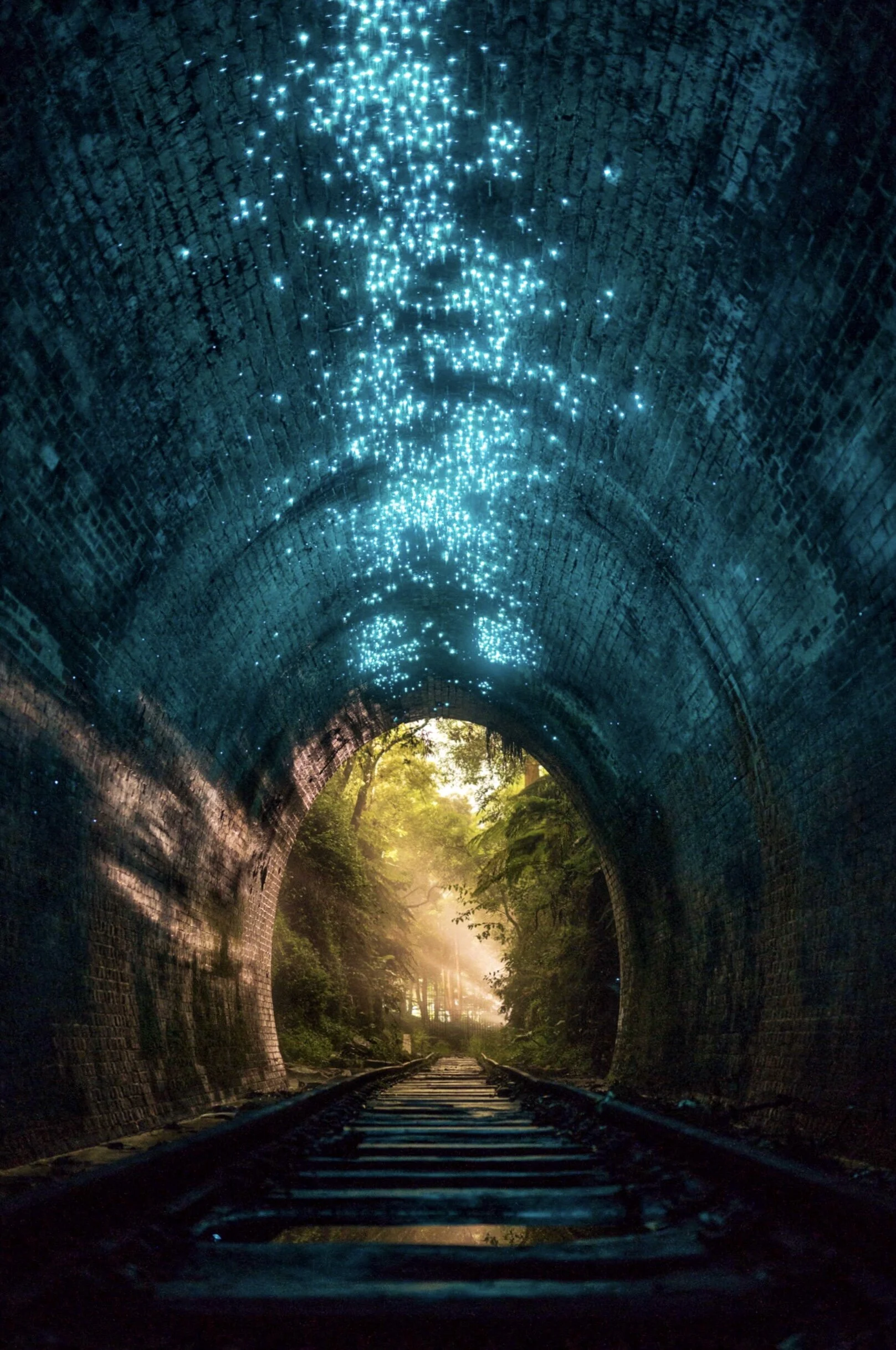 The shining blue stars are glowworms living in an abandoned train tunnel in Helensburgh, Sydney.