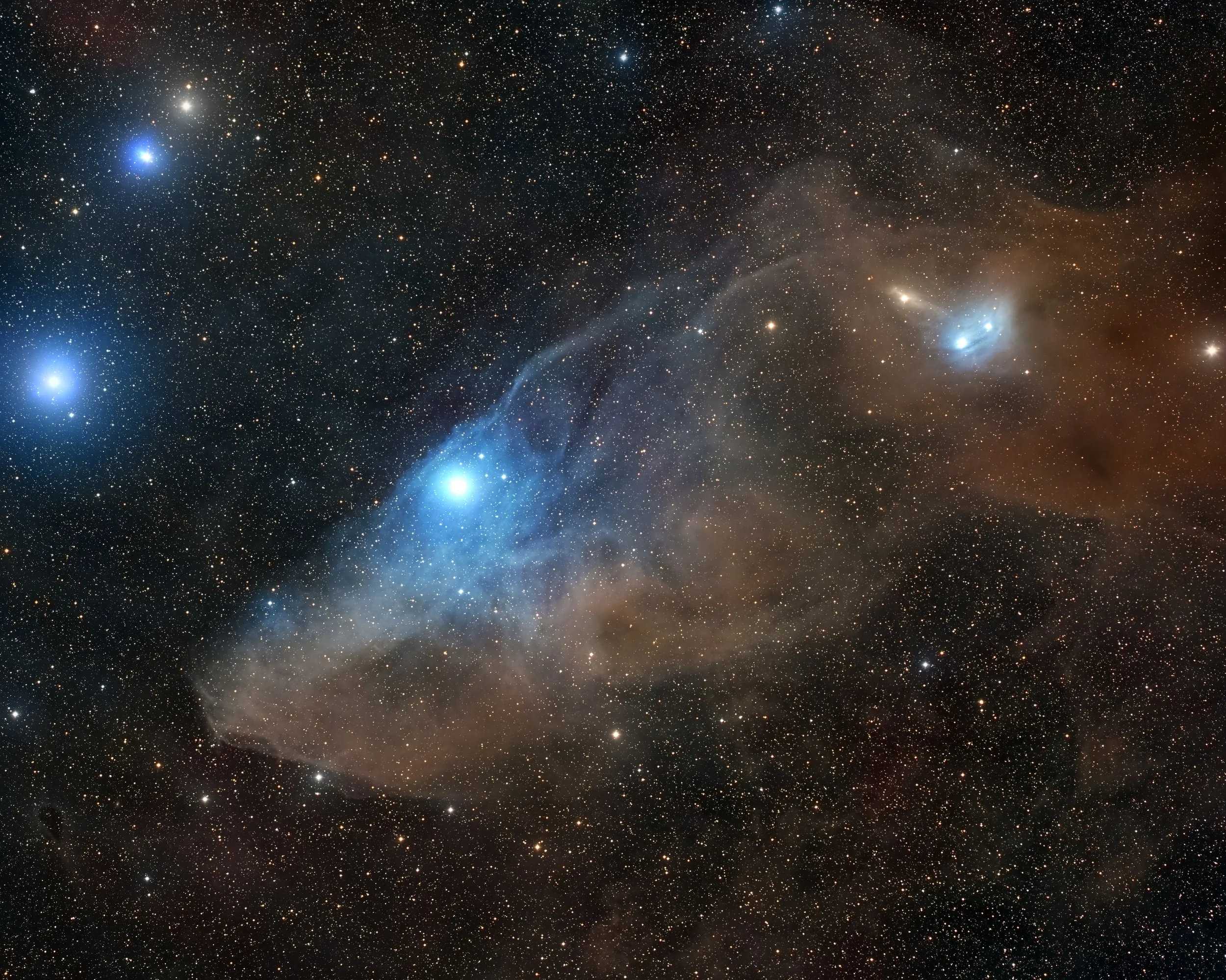 IC 4592 is a rarely photographed reflection nebula in the constellation Scorpius. It has a distinctive horsehead shape but is overwhelmingly overshadowed by another horsehead-shaped nebula - Barnard 33, "The Horsehead Nebula". The blue light comes from fine dust reflecting the light of nearby stars. In this case, much of the reflected light comes from the star at the eye of the horse called "Nu Scorpii". A second reflection nebula surrounding two stars is also visible to the right of the image, called IC 4601.