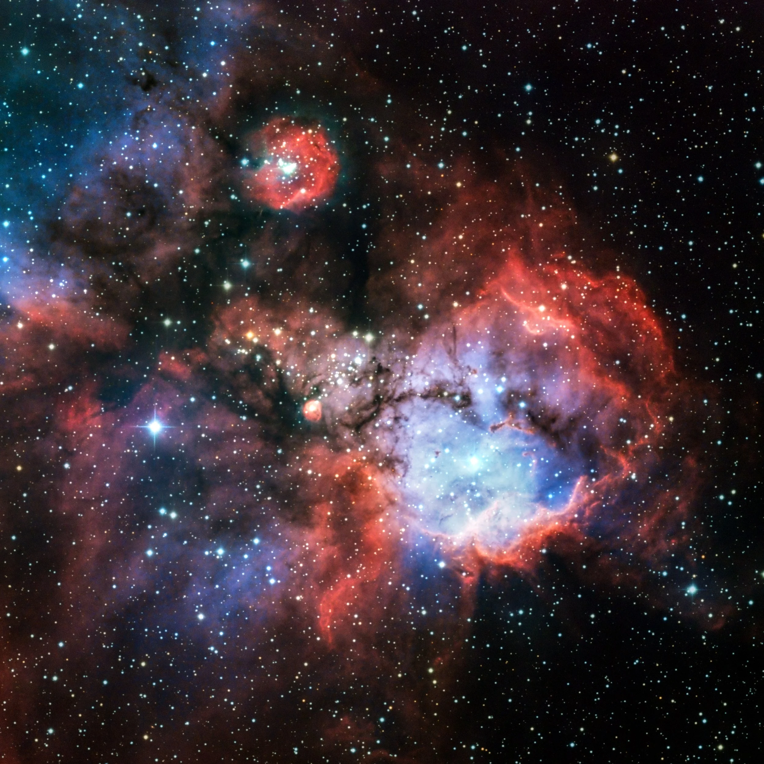 Skulls aside, the nebula is made of star-forming regions where large gas clouds are giving birth to new stars. The skull's left eye is a superluminous star (HD 64455), which looks especially shiny because of the telescope's diffraction spikes. The skull's right eye is a sphere of hydrogen gas energised by a nearby star (Haffner 19). The pink-red glimmer from ionised hydrogen makes it look like the terminator's cyborg eye!