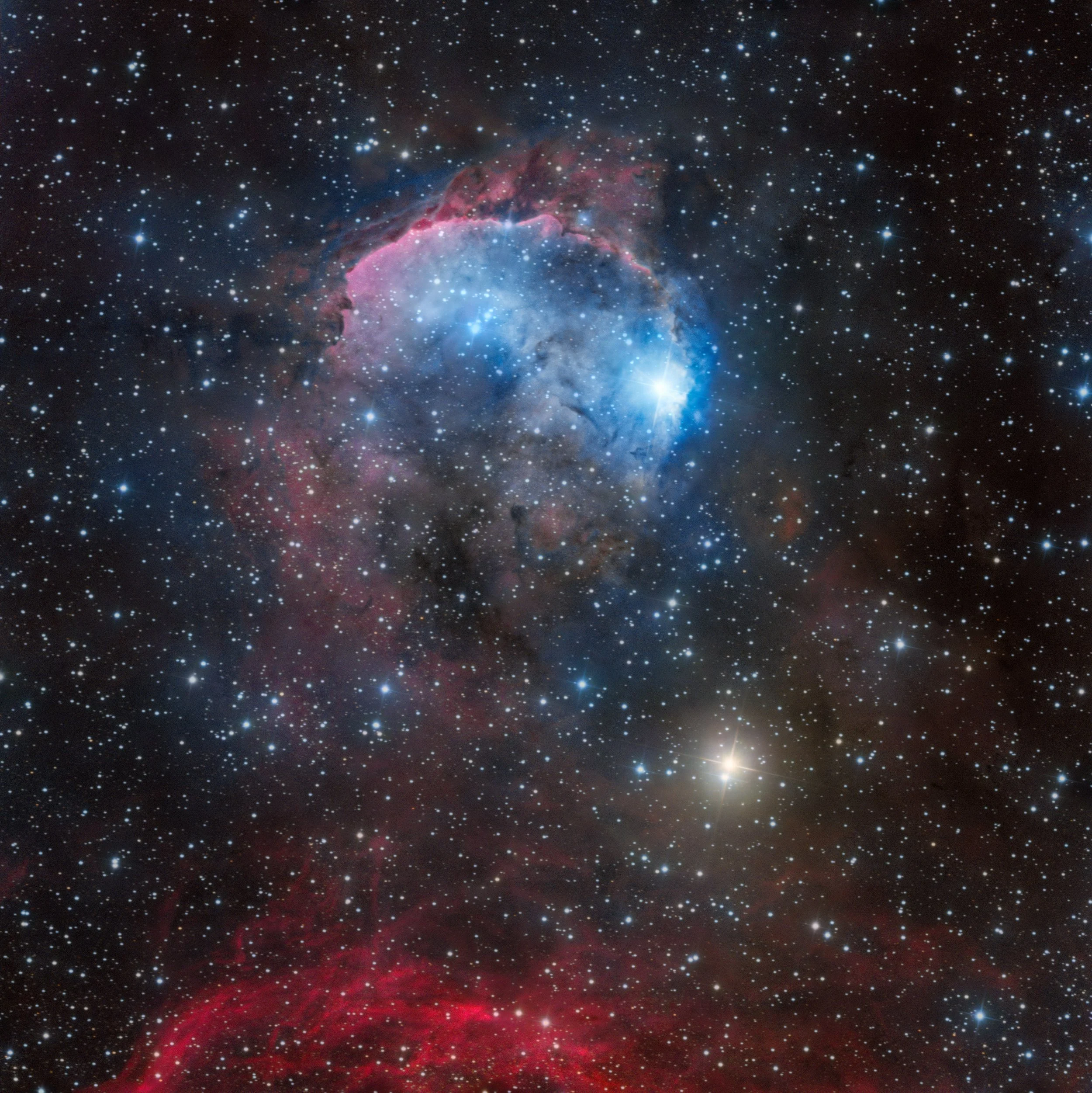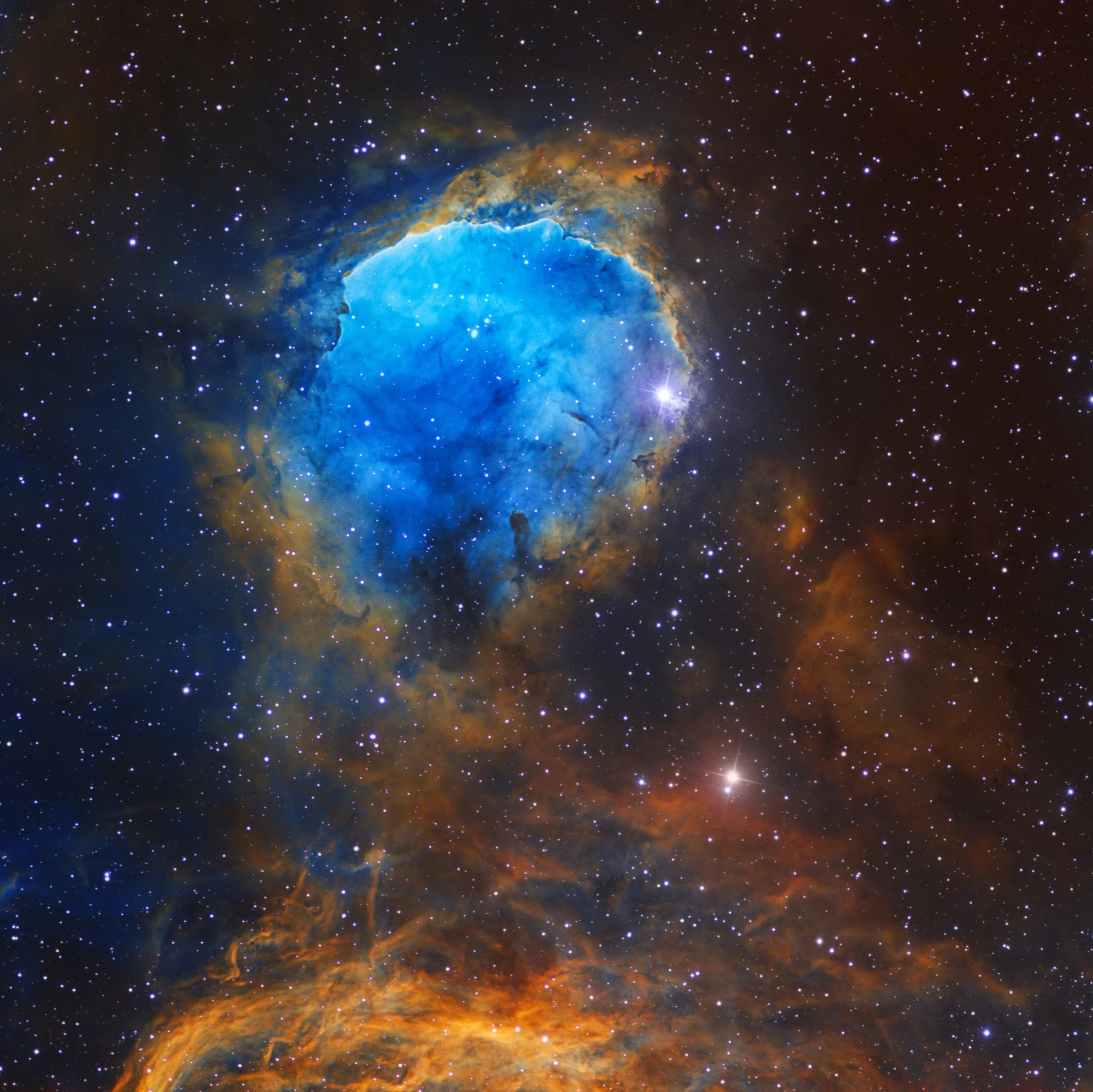 This is a narrowband image of the Gabriela Mistral Nebula, an open cluster in the southern constellation Carina. The emissions from different elements were put into different colour channels to differentiate their origins. The blue colour indicates the presence of Oxygen; bright yellow Hydrogen and dark red sulfur (also called 'the Hubble Palette’). It’s an elegant way of combining the beauty of science and nature.