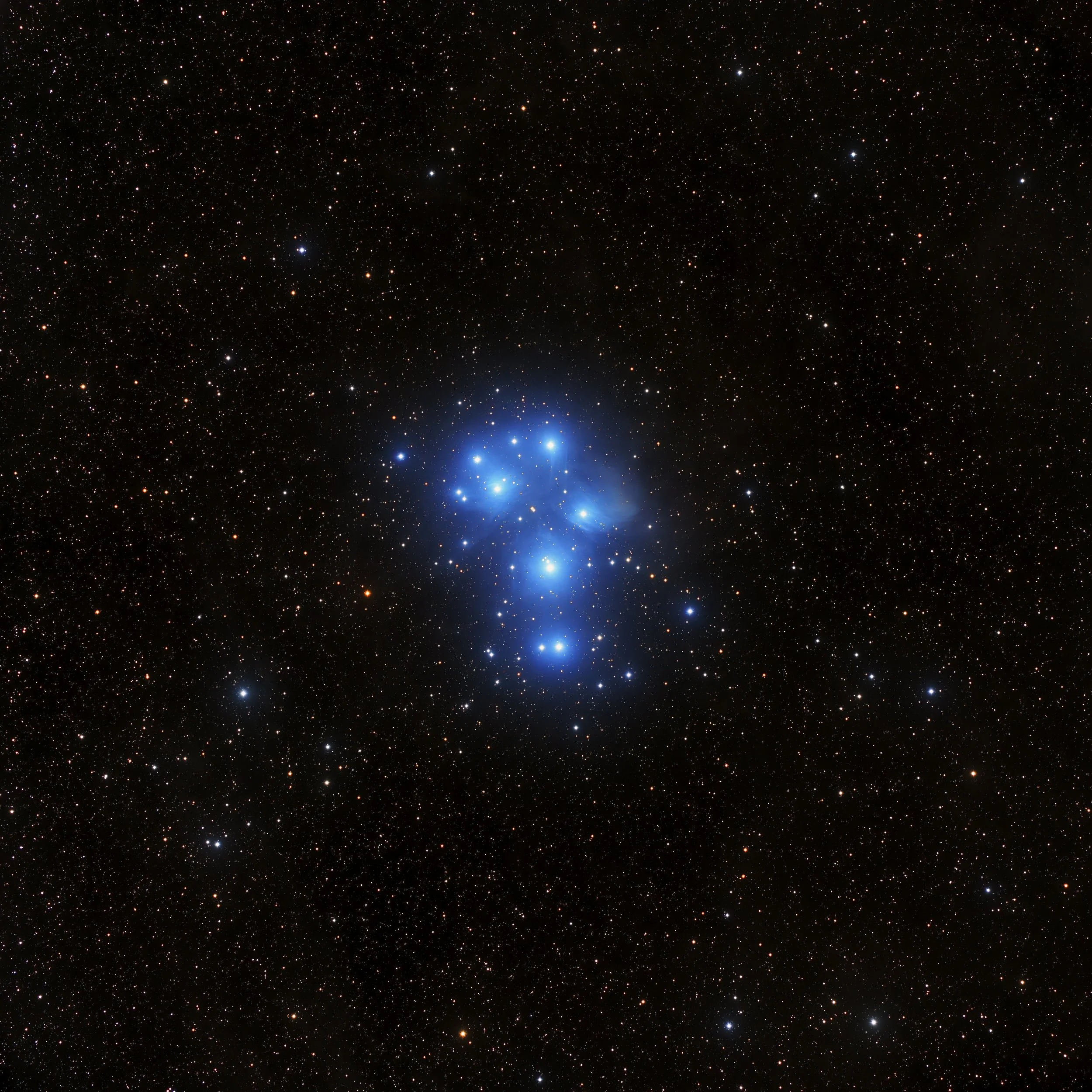 The Pleiades is an incredibly beautiful and interesting celestial object. For a long time, our ancestors awed upon its existence and pondered the message it carries. For ancient Greeks, they are seven sisters transformed into stars to accompany their father Zeus. Interestingly, modern science revealed that the seven stars really are 'sisters’; because they are born together from the same molecular cloud about 100 million years ago. In human multiple births, we call two babies twins, three triplets, four quadruplets... The Pleiades would have been called a 'hundruplets' because the giant cloud gave birth to hundreds of stars at the same time!