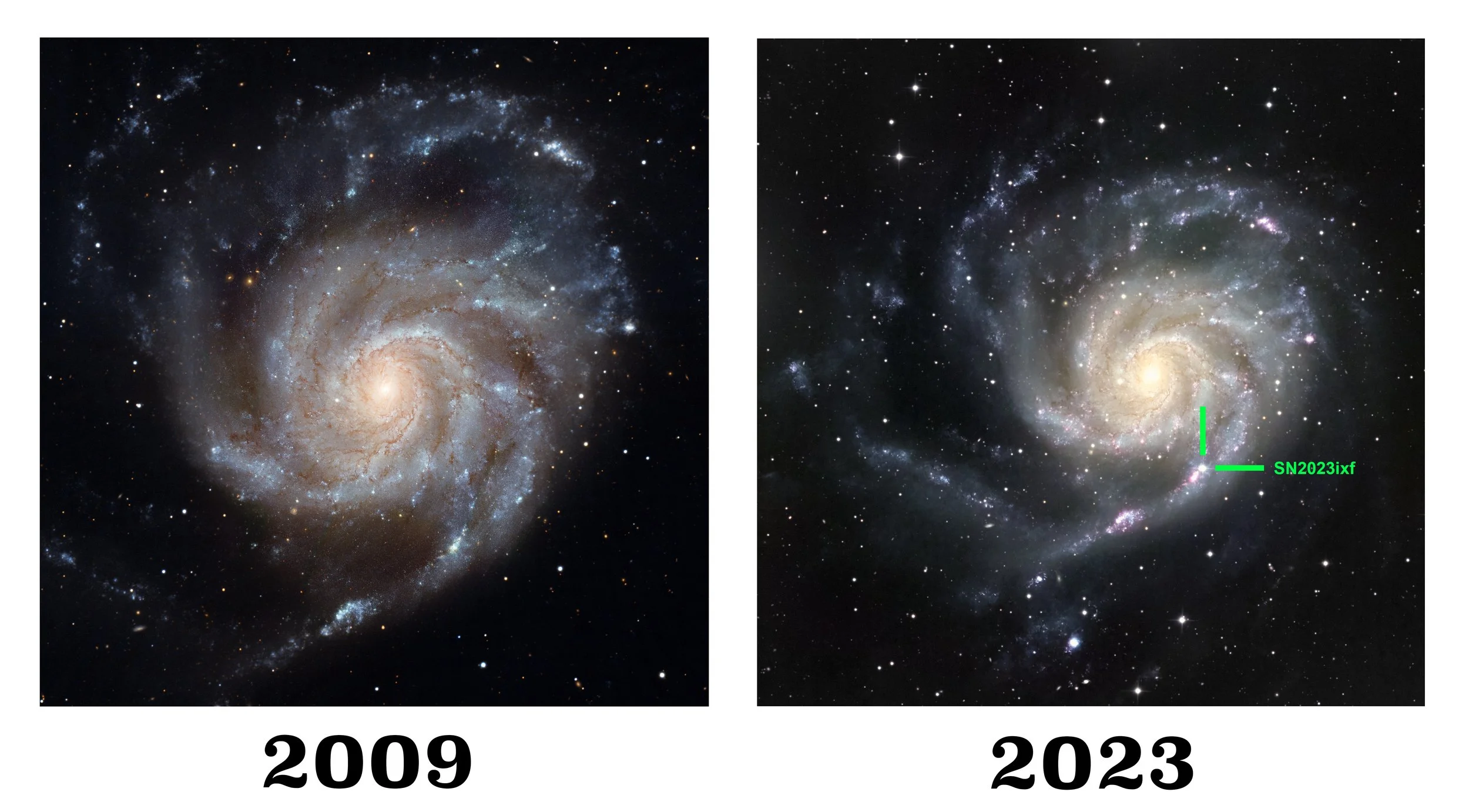 A star in a distant galaxy, named the Pinwheel Galaxy or Messier 101, has just exploded in a supernova. It briefly lights up its corner of the universe, and in doing so, it becomes a beacon across space and time. Picture 2 shows where the supernova is, and what the galaxy looked like before this supernova explosion in 2009 (Hubble Image released by ESA).