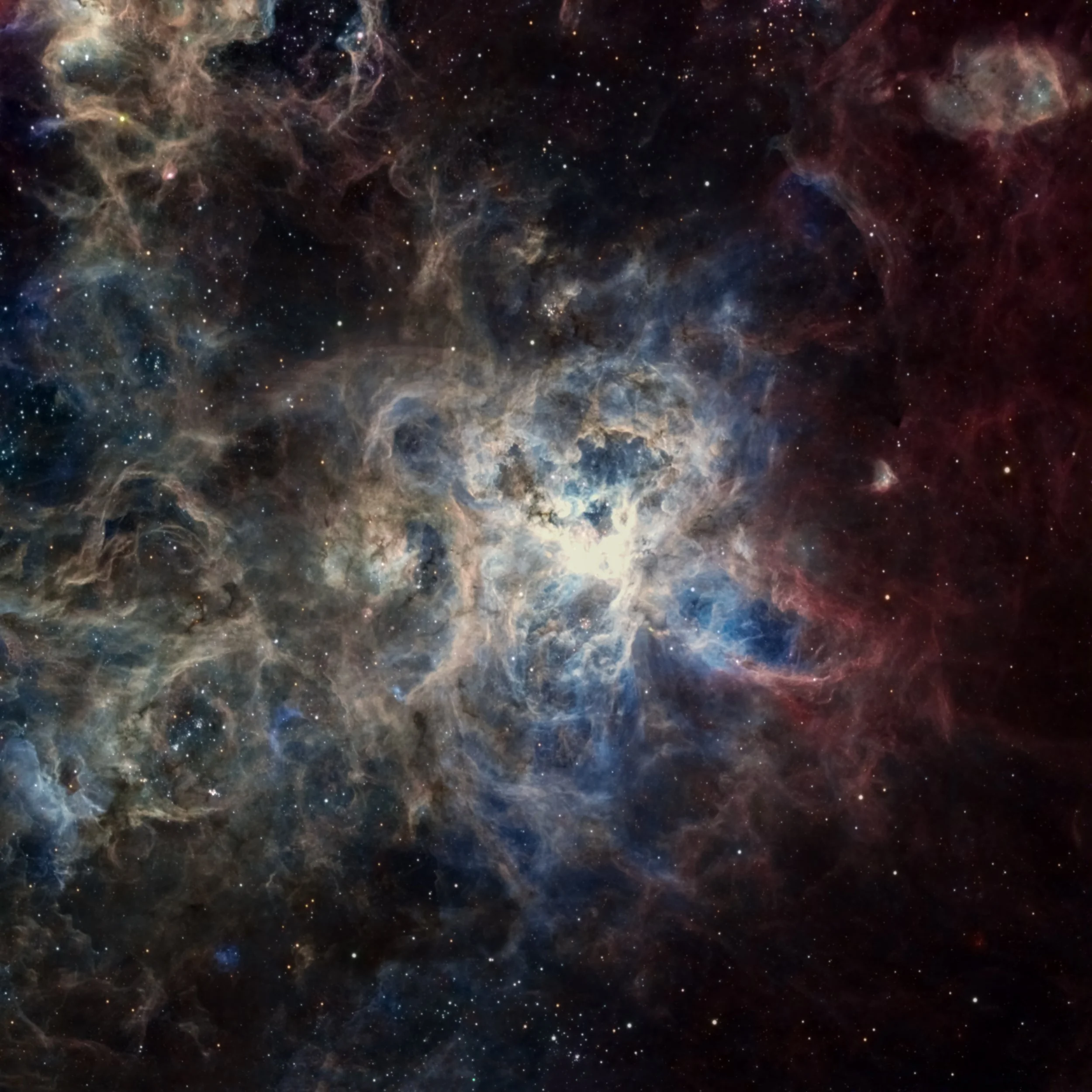 The chaotic interaction of newborn stars and newly exploded supernovas created vast amounts of radiation and fierce interstellar wind. It blows the gigantic interstellar cloud into several cavities and streams of dust lanes. The radiation from those events ionised the gas clouds and caused them to shine in stunning colours.