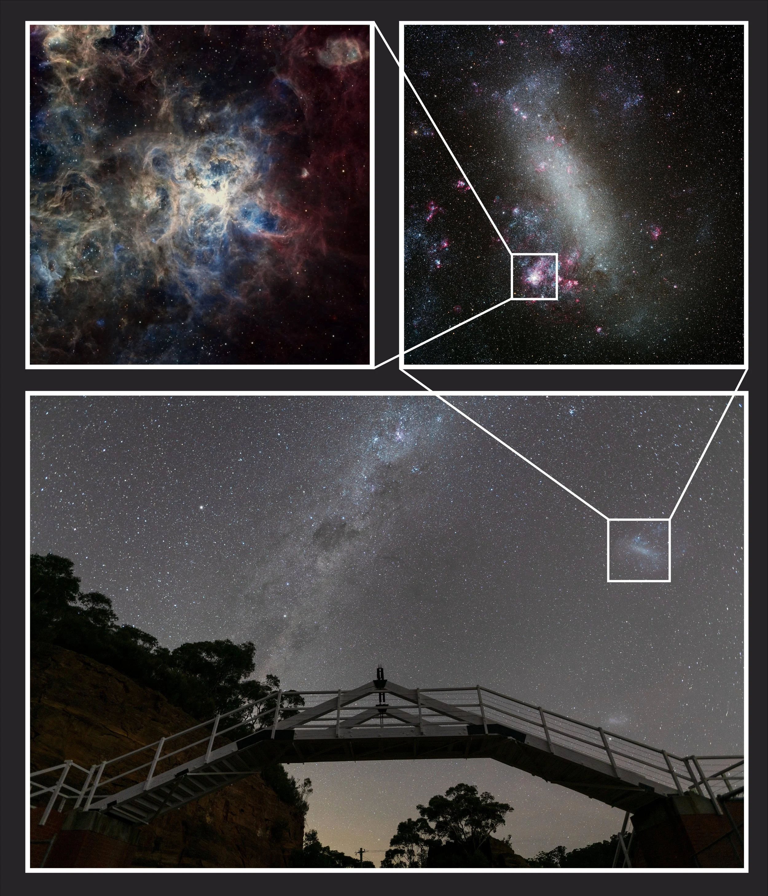 For us lucky few living in the Southern Hemisphere, the Magellanic cloud is a marvellous wonder to observe. The second photo illustrates what the Large Magellanic Cloud looks like in the Southern Sky, and where the Tarantula Nebula is within the Cloud. The picture with the tail of the Milky Way was taken near an abandoned train station in the Blue Mountains. It was a magical and unforgettable night.