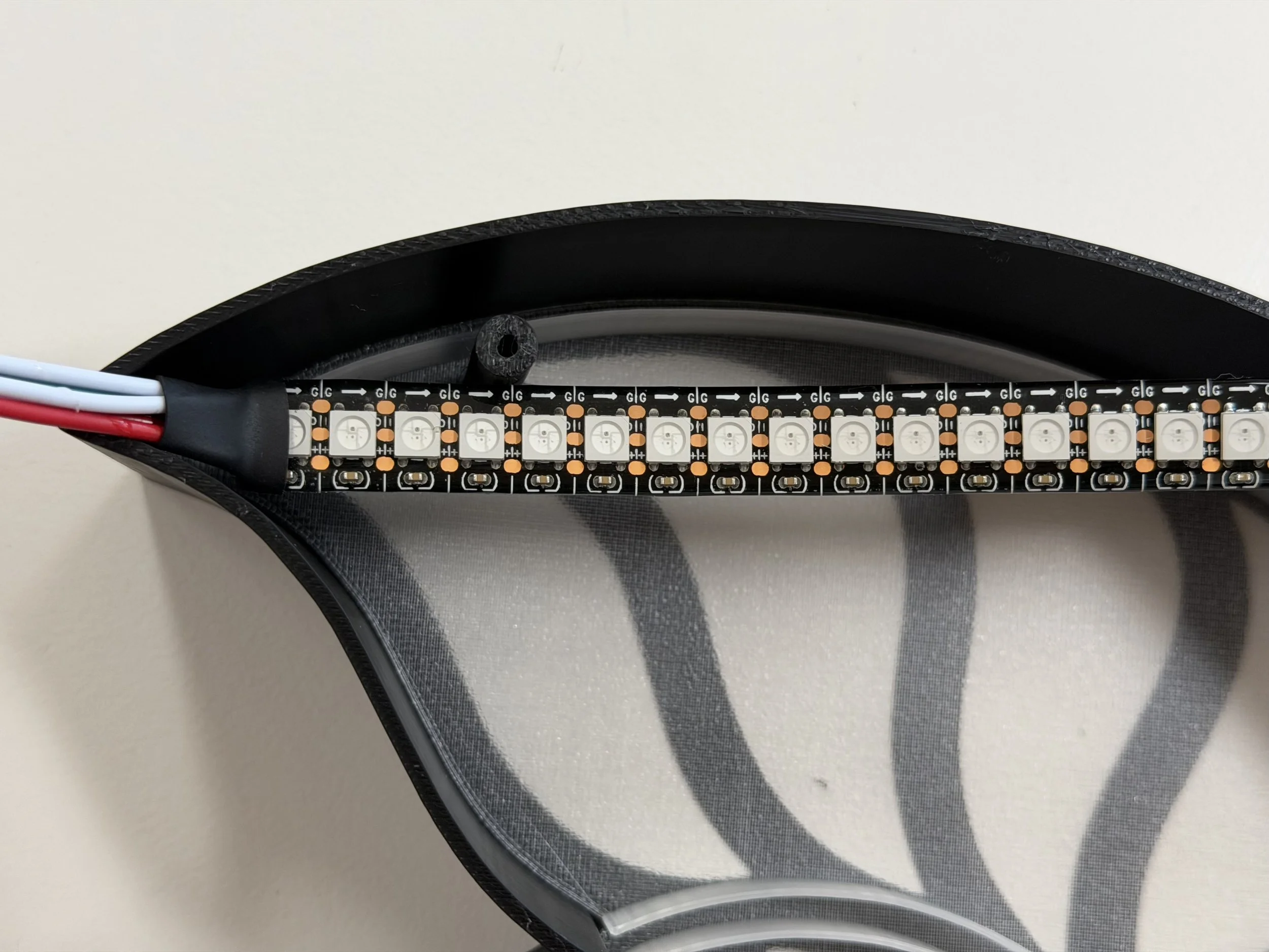 Step 3: There is a groove specifically designed for the LED strip right between the black enclosure and the transparent diffuser. Place the LED strip into this groove. The groove should perfectly fit exactly 1 meter of the strip (as shown in the picture, but absolutely double-check the arrow direction again before pressing it in).