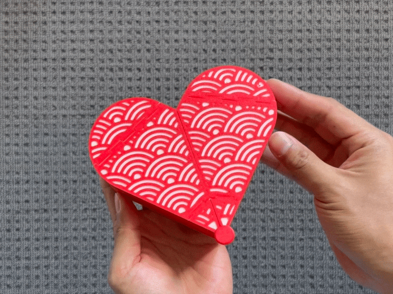 I designed this heart-shaped box with inspiration from Japanese origami. The lid opens through a folding motion, similar to how origami unfolds. Both the box and the lid are decorated with traditional Japanese-style patterns.