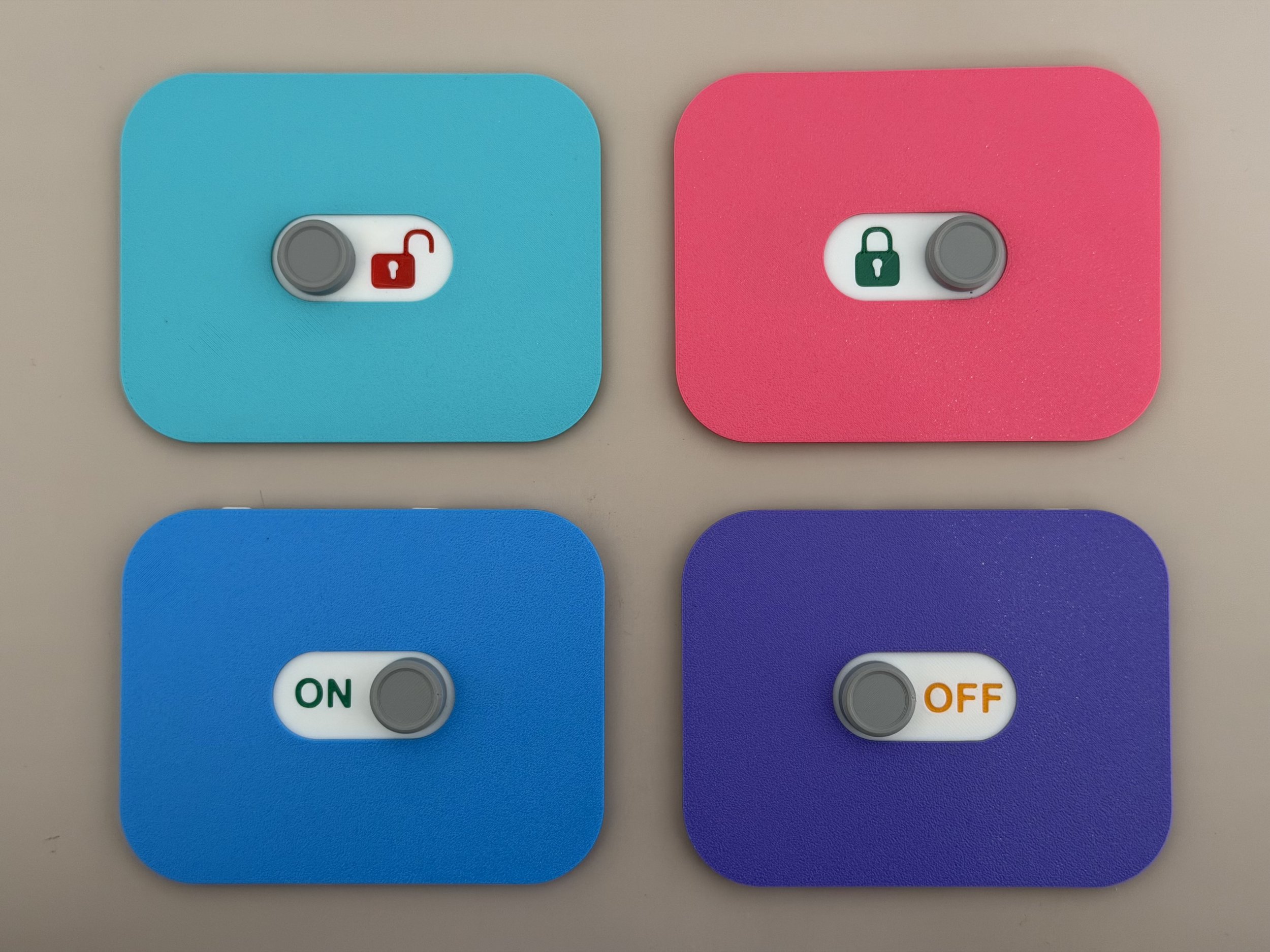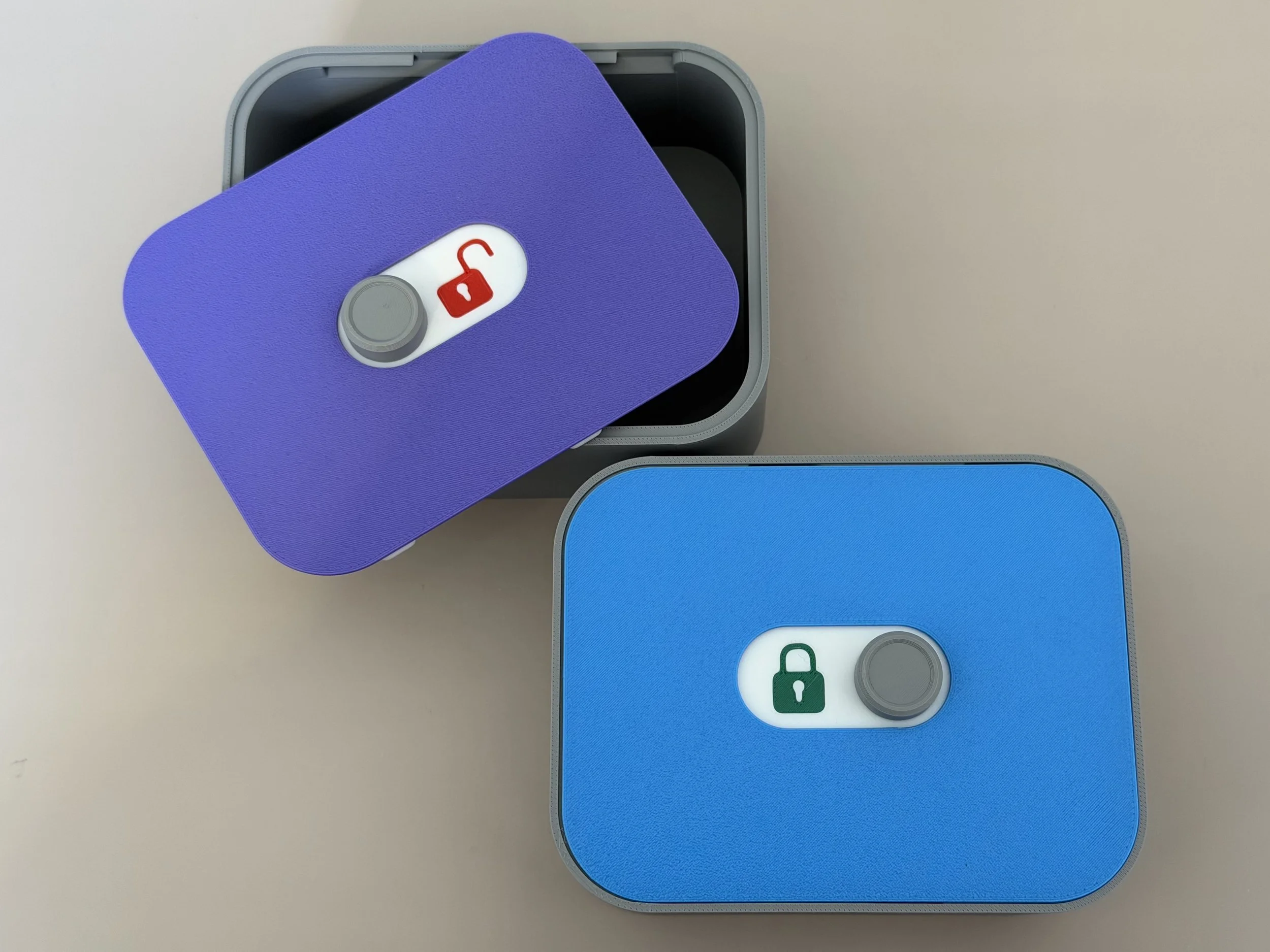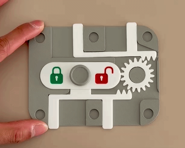 Here is a box I designed with a sliding toggle mechanism. Sliding the toggle to one side locks the box and reveals ON, meaning the lock is engaged. Sliding it to the other side unlocks the box and reveals OFF. ( I also made another toggle with a more obvious LOCK / UNLOCK label).