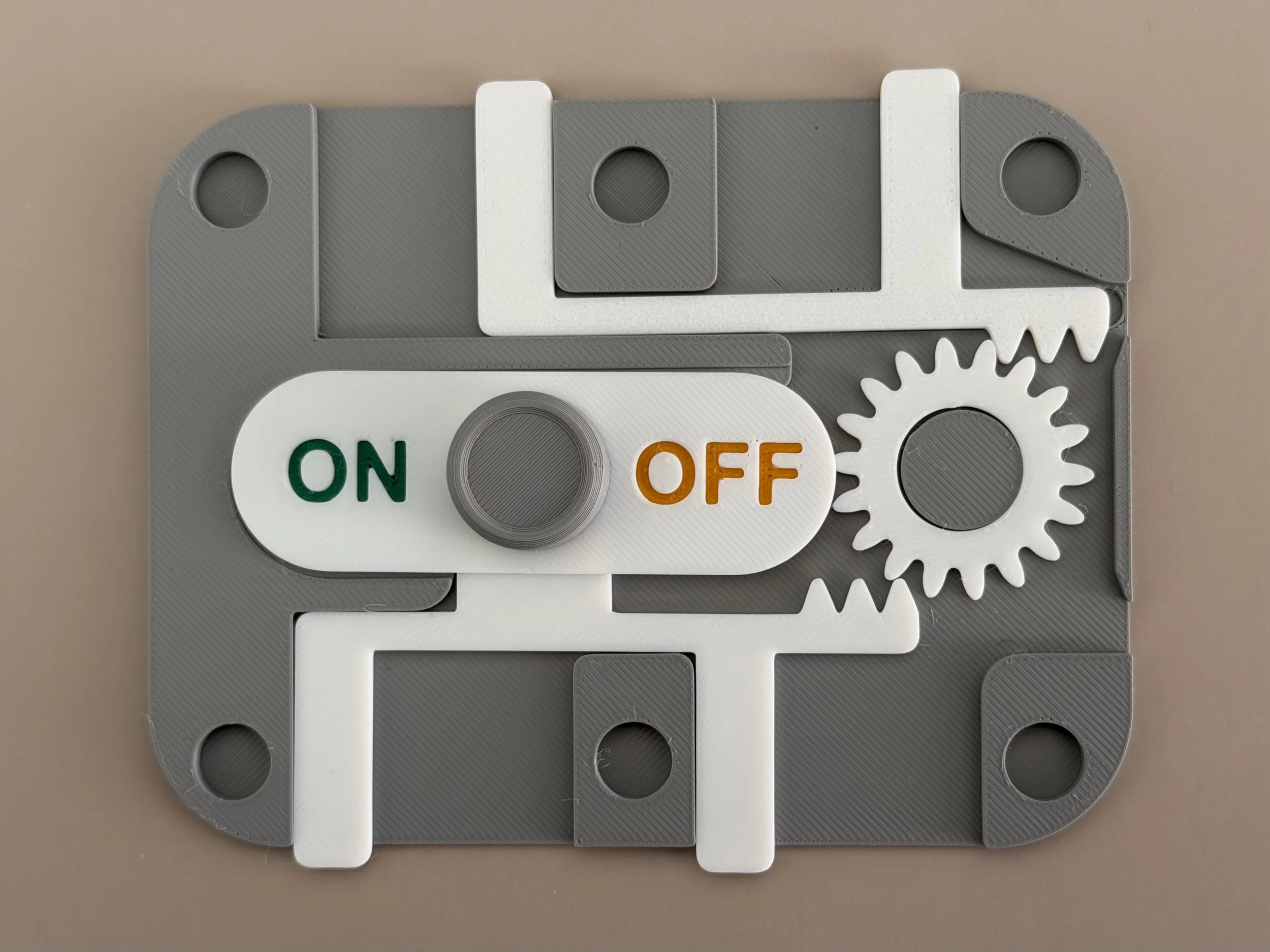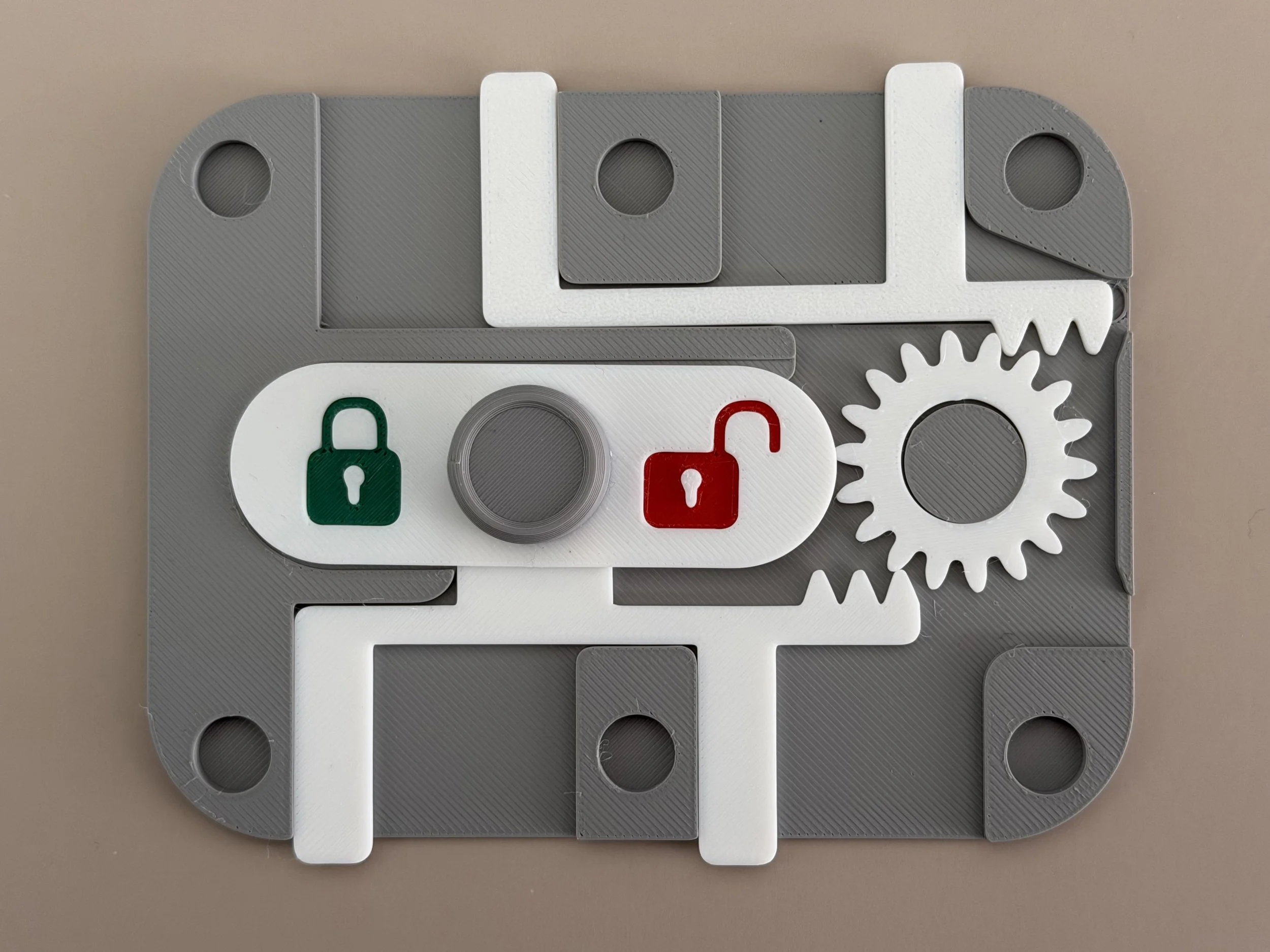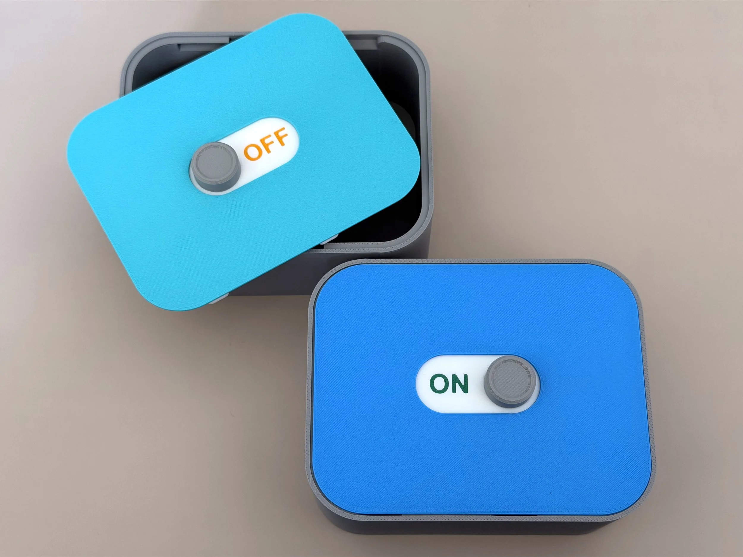 Here is a box I designed with a sliding toggle mechanism. Sliding the toggle to one side locks the box and reveals ON, meaning the lock is engaged. Sliding it to the other side unlocks the box and reveals OFF. ( I also made another toggle with a more obvious LOCK / UNLOCK label).